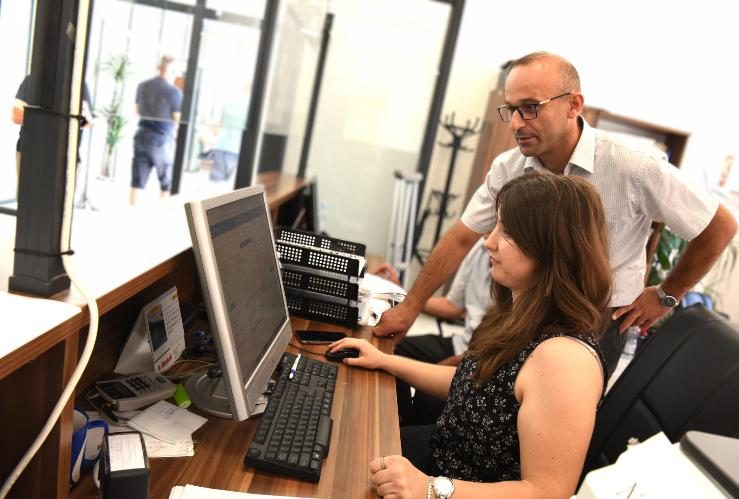 Maljbore Ćerimi pokazuje zahtev za boravište Burimu Gašiju, šefu Odeljenja opšte administracije, tokom svog stažiranja u opštini Lipljan.