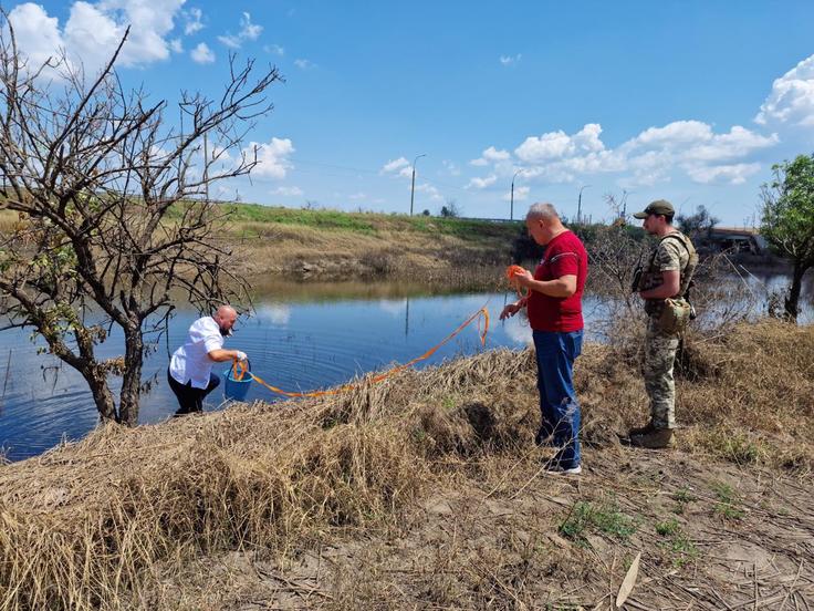 Experts gather water samples in the area, affected by Kakhovka dam breach.