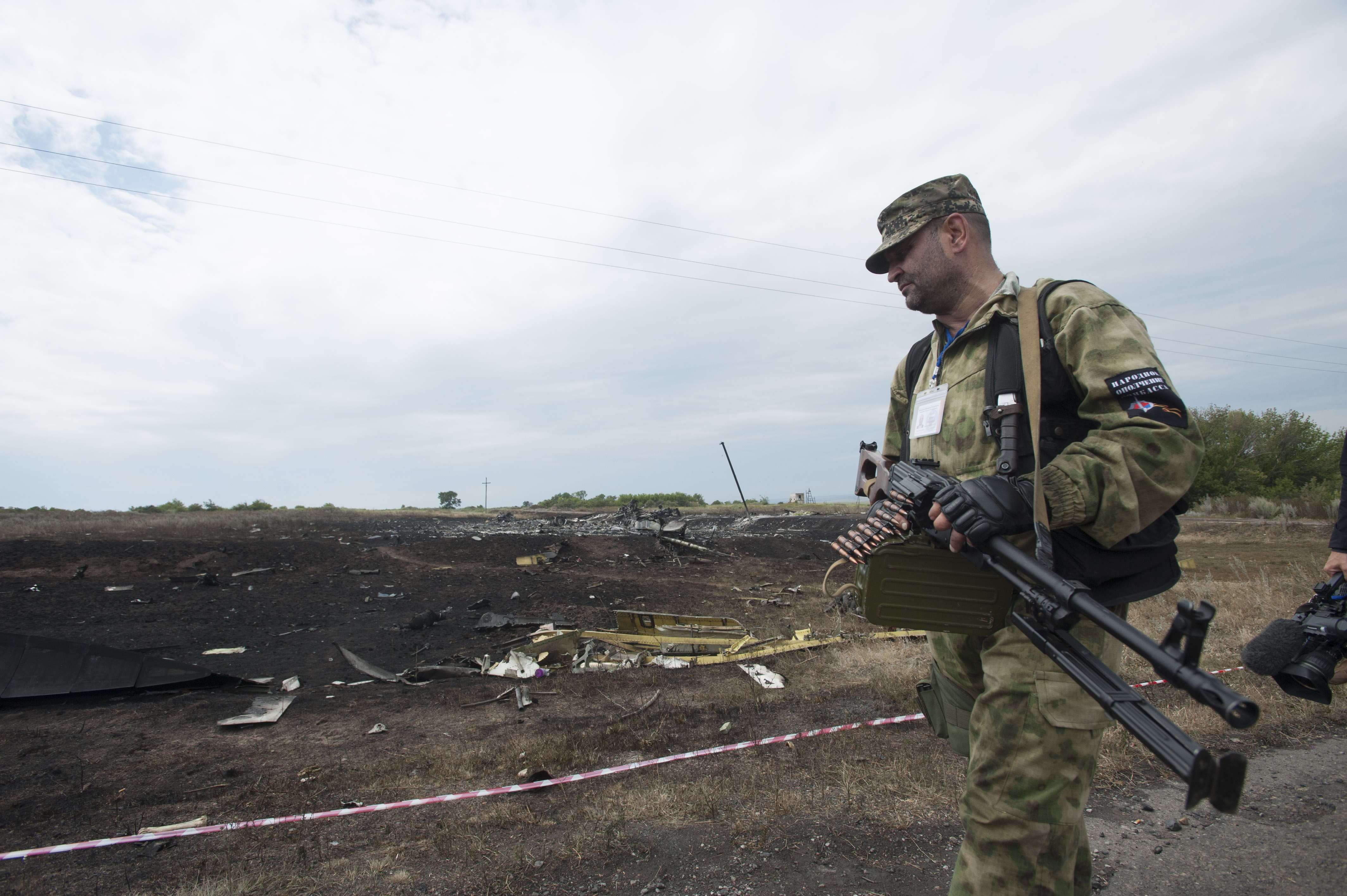 Добре озброєний, без розпізнавальних знаків, сепаратист стоїть на сторожі місця аварії MH17.