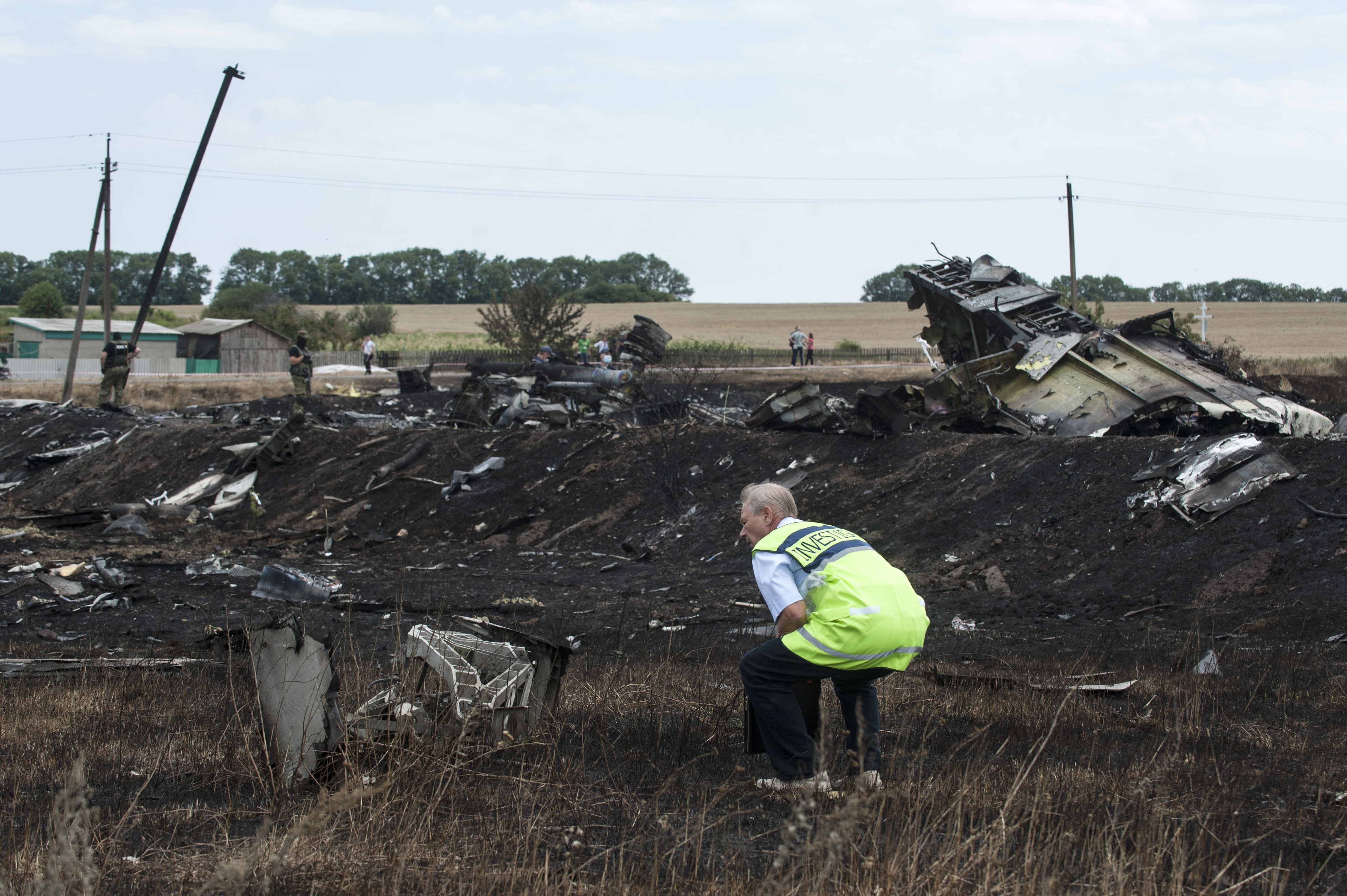 Український судово-медичний експерт оглядає шматок уламків на місці аварії MH17.