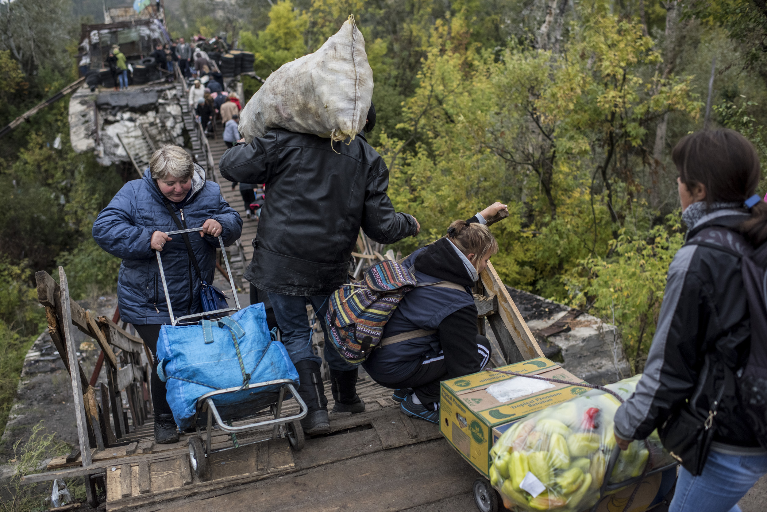 Мирні жителі перетинають зруйнований міст у Станиці Луганській, вересень 2016 року. Спостерігачі СММ знову і знову чують, що люди з обох боків лінії розмежування вже достатньо настраждалися — вони заслуговують на нормалізацію і готові до розведення сил і засобів.