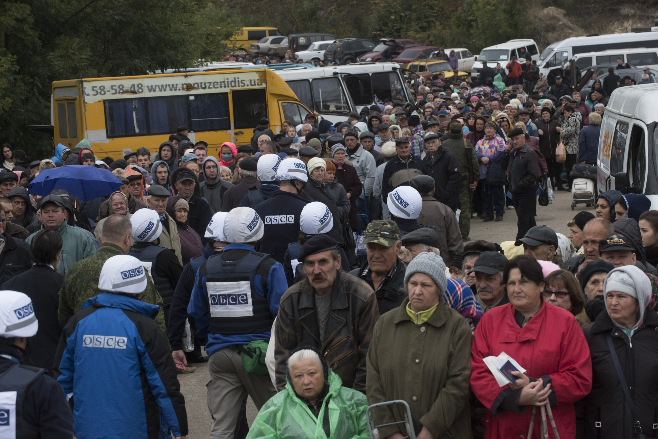 Мирні жителі в черзі на контрольному пункті в’їзду-виїзду у Станиці Луганській, вересень 2016 року. Розведення сил, відведення озброєнь, а також позначення, огородження та вилучення мін, боєприпасів, що не розірвалися, а також вибухонебезпечних пережитків війни допоможе полегшити життя цивільного населення, на плечі якого лягає увесь тягар наслідків порушень режиму припинення вогню.
