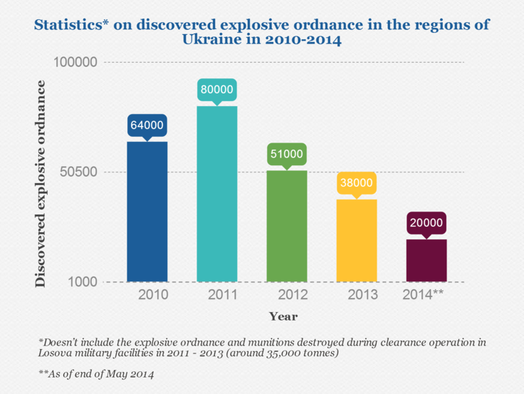 According to official statistics, during the first five months of 2014 over 20 thousand dangerous military items were discovered in Ukraine. In 2012-2013 deminers had to deal with almost 90 thousand explosive objects, and this figure doesn’t include the 35 thousand tonnes of bombs, shells and mines that were destroyed in Lozova, Kharkiv region, in the course of a clearance operation in the areas, affected by a 2008 accident at an ammunition storage base.